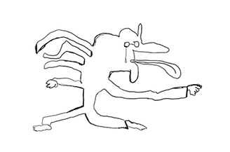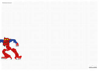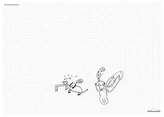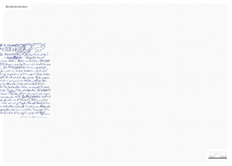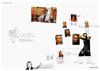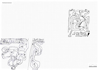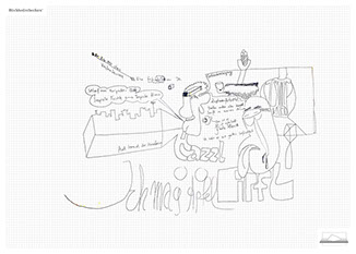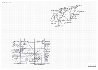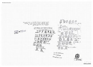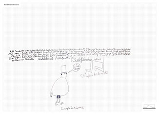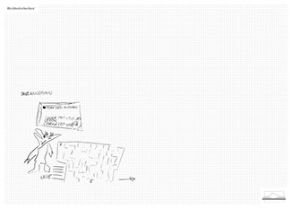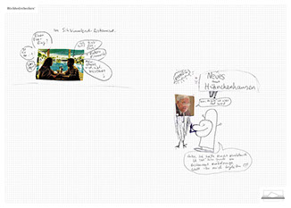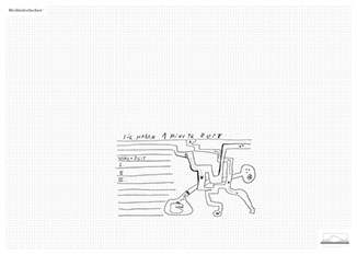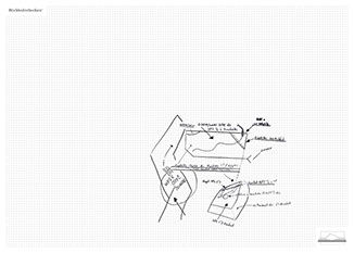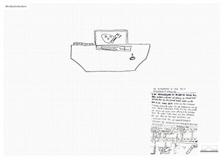 The installation consists of an artificially built room covered with white molton, measured 2,20 m x 1,60 m x 2,20 m; dark blue carpeting, a brown chair and a red painted table including a 70-page 50 cm x 70 cm desk pad. There is also a 2 m x 1,50 m whiteboard on the right side of the installation.