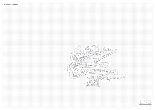 The installation consists of an artificially built room covered with white molton, measured 2,20 m x 1,60 m x 2,20 m; dark blue carpeting, a brown chair and a red painted table including a 70-page 50 cm x 70 cm desk pad. There is also a 2 m x 1,50 m whiteboard on the right side of the installation. The 'Rückhaltebecken'-branded pens can be used to put random thoughts and ideas or comments/continuations on both the whiteboard and the desk pad. It is requested that only one person stays in the room at a time for about 10-15 minutes.