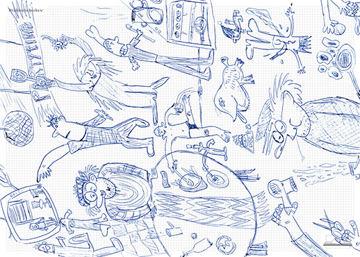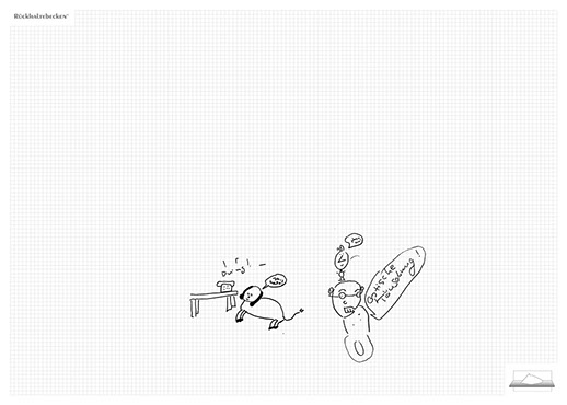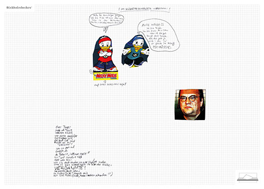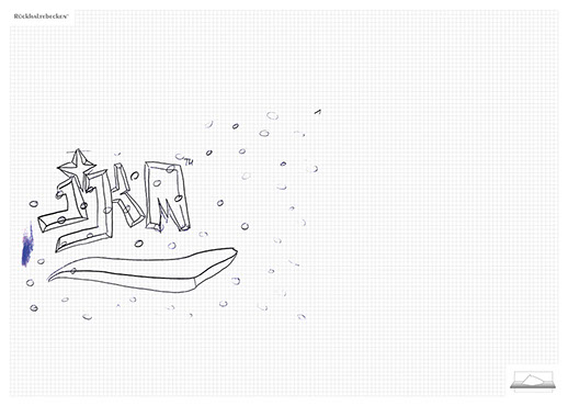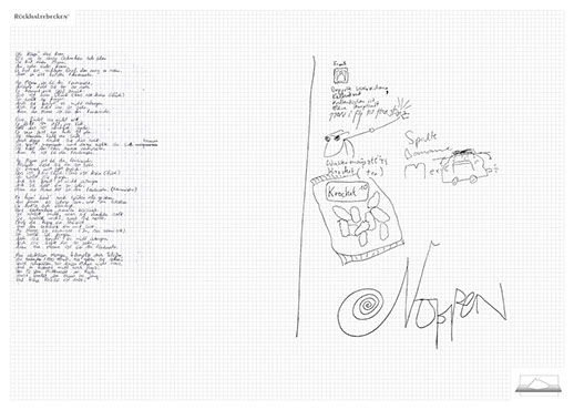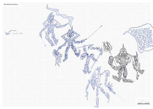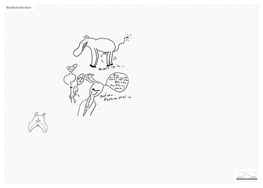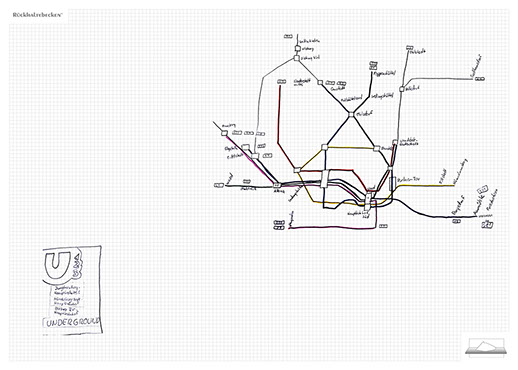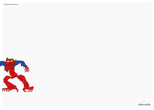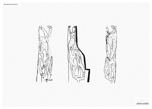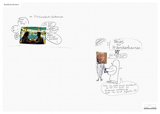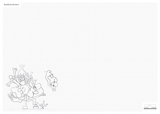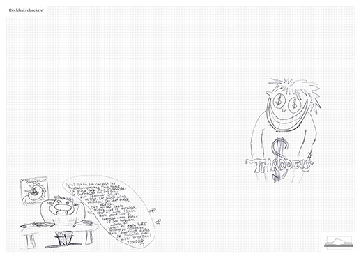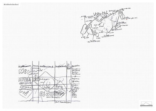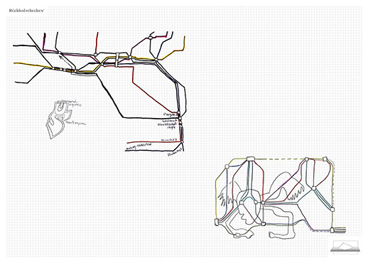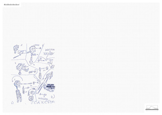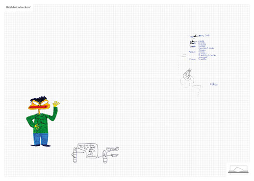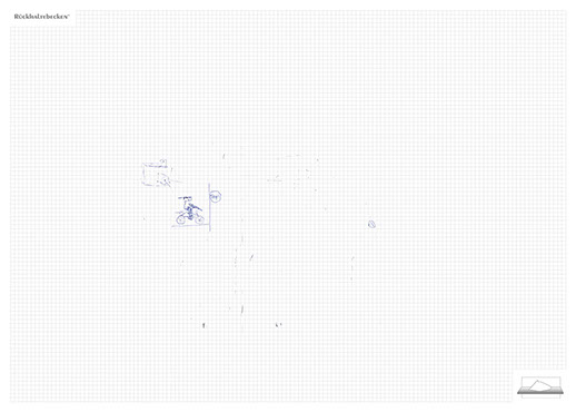 The ironic branding 'Rückhaltebecken' is a nod to my own imaginative publishing companies when I was a child and means 'Retention basin'. In the case of this installation the creations and ideas are held back in the room, just like the water in a basin. The logo of 'Rückhaltebecken' consists of an outline of a retention basin near my past home, placed on a table top.