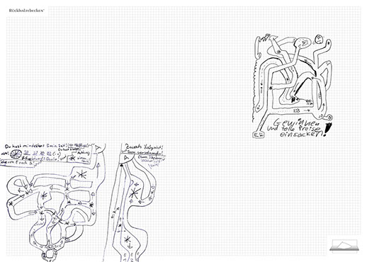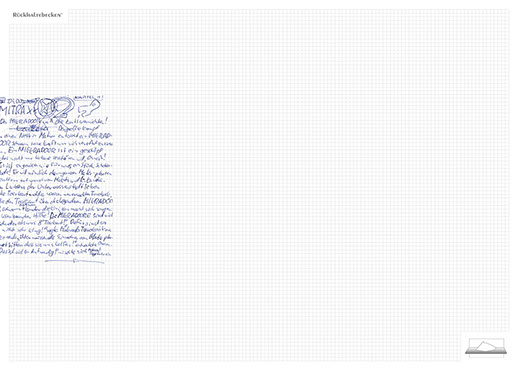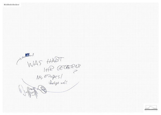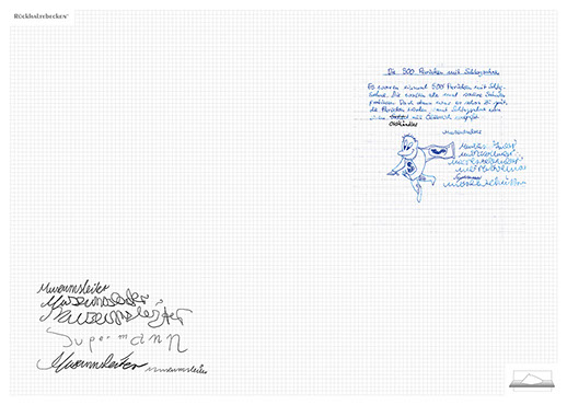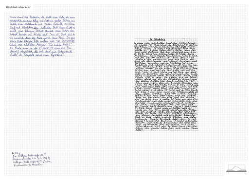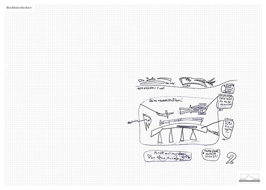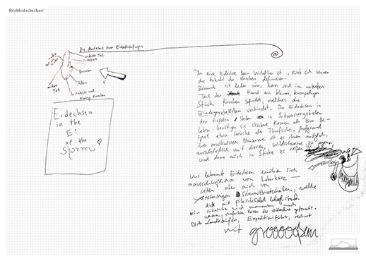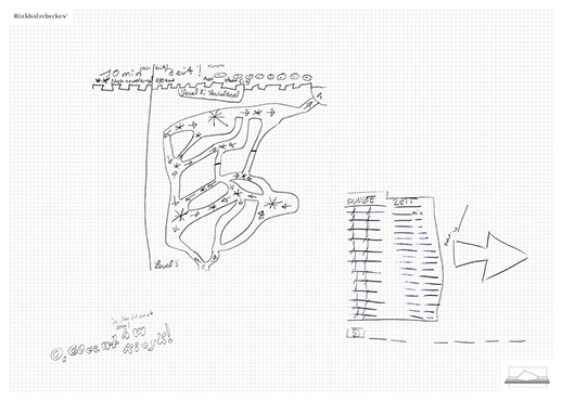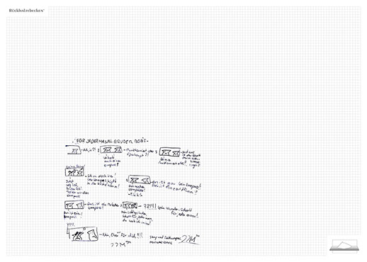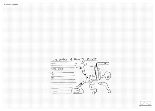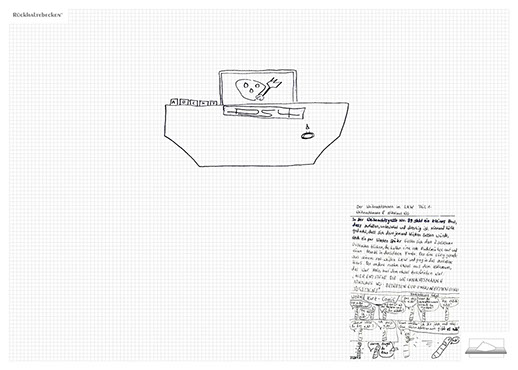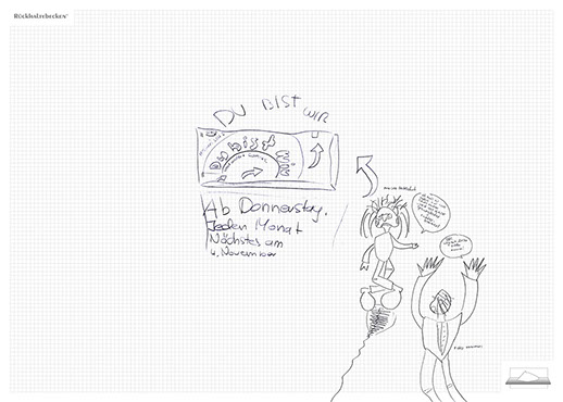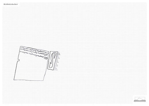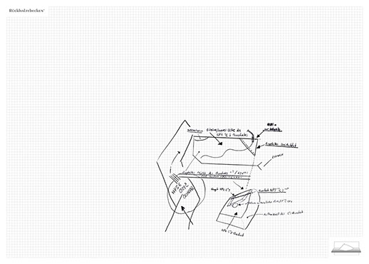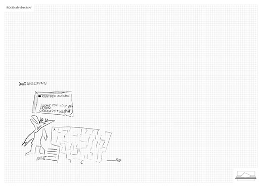 The installation consists of an artificially built room covered with white molton, measured 2,20 m x 1,60 m x 2,20 m; dark blue carpeting, a brown chair and a red painted table including a 70-page 50 cm x 70 cm desk pad. There is also a 2 m x 1,50 m whiteboard on the right side of the installation. The 'Rückhaltebecken'-branded pens can be used to put random thoughts and ideas or comments/continuations on both the whiteboard and the desk pad. It is requested that only one person stays in the room at a time for about 10-15 minutes.