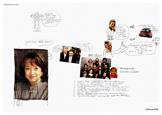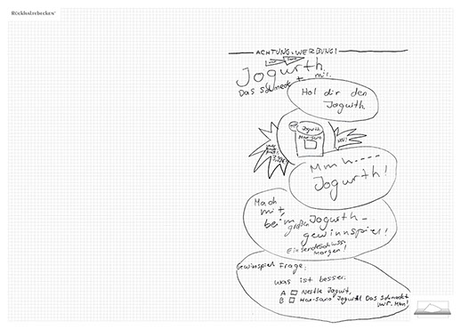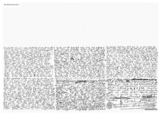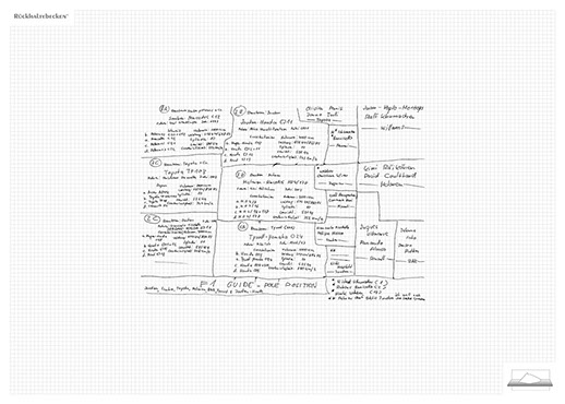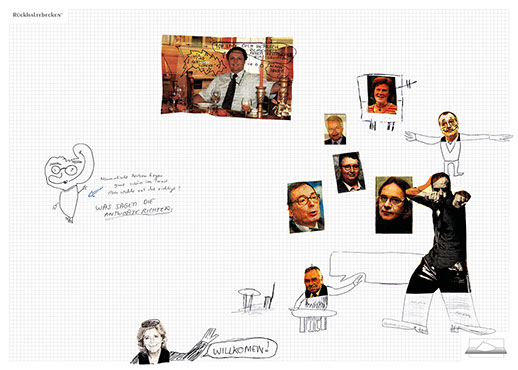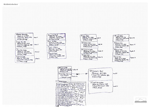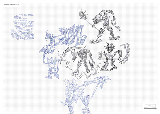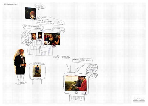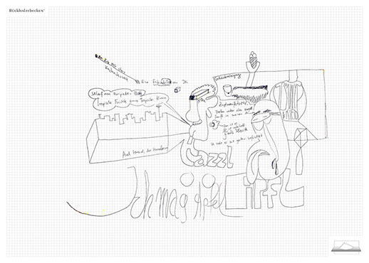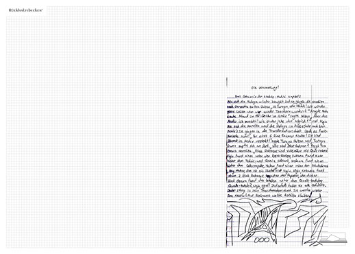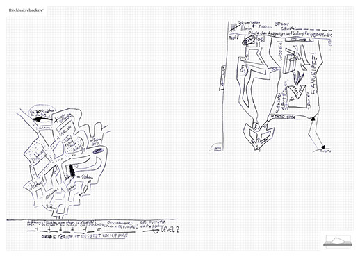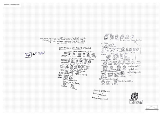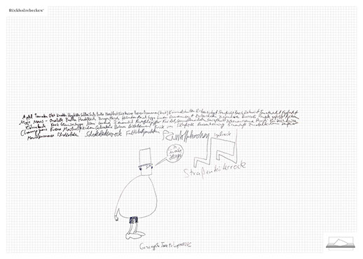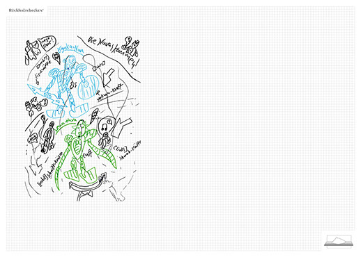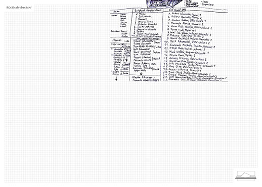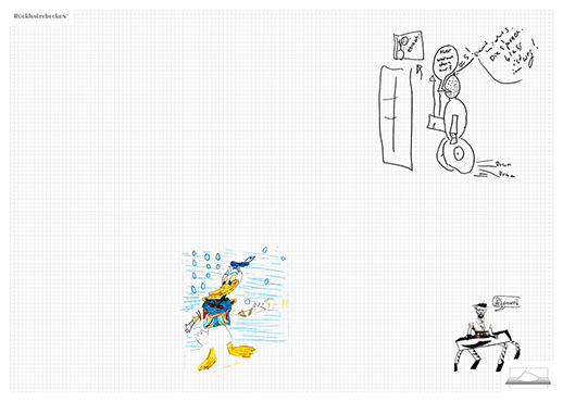 The installation consists of an artificially built room covered with white molton, measured 2,20 m x 1,60 m x 2,20 m; dark blue carpeting, a brown chair and a red painted table including a 70-page 50 cm x 70 cm desk pad. There is also a 2 m x 1,50 m whiteboard on the right side of the installation. The 'Rückhaltebecken'-branded pens can be used to put random thoughts and ideas or comments/continuations on both the whiteboard and the desk pad. It is requested that only one person stays in the room at a time for about 10-15 minutes.